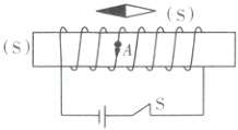 5. (人教版九年级 P155 练习与应用图 20.2 - 7 改编)如图所示,请在括号内标出通电螺线管左端的磁极、小磁针右端的磁极以及导线上 A 点的电流方向。(磁极均用“N”或“S”表示)