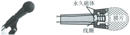 13. (人教版九年级 P171 练习与应用 4 题改编)当你唱卡拉 OK 时,要用到话筒(麦克风)。话筒的种类有很多,如图是动圈式话筒构造示意图。当你对着话筒说话或唱歌时,产生的声音使膜片振动,与膜片相连的线圈也跟着一起振动,线圈在磁场中的这种运动,能产生随着声音的变化而变化的