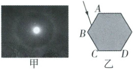 9. 如图甲是某博主在内蒙古拍摄的超大“幻月环”。“幻月环”是一种独特的大气现象,当月光透过高空云层时,经过云层中六棱冰晶的折射,便形成了这种壮观的环形光晕。如图乙,一束光从六棱冰晶的 $AB$面射入,请在图中作出光经六棱冰晶折射后从 $CD$面射出的大致光路。