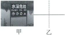 10. 如图甲所示,小明发现水塘边竖有一“水深危险”的牌子,可是看起来水很浅啊$!$请你在图乙中作出能说明该原因的一条光路。