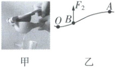 10. 如图甲是一个手动榨汁机,其上部手柄在使用时可看作一个杠杆,图乙是其简化的示意图$,O$为支点$,F_2$是压水果时 $B$点受到的阻力。请在图乙中画出作用在 $A$点的最小动力 $F_1$的示意图及阻力臂 $l_2$。