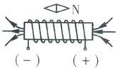 8. 如图所示,根据通电螺线管的磁感线方向,在导线端括号内标出所接的电源“$+$”“$-$”极,以及小磁针的 $N$极。