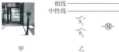 3. 某小区的门禁系统利用电动机实现开关门。业主可利用人脸识别(相当于开关 $S_1$)或门禁卡(相当于开关 $S_2$)自动开门进入小区$;$请在图乙中用笔画线代替导线将电路连接完整。