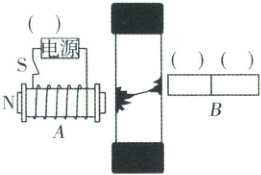 9. 磁流体是一种新型的功能材料,它既具有液体的流动性又具有固体磁性材料的磁性。磁流体周围如果存在磁场,就会“模拟”出磁感线的形状。如图所示,水杯中放有磁流体,左侧为电磁铁 $A$,右侧为永磁体 $B$,闭合 $S$后的情景如图所示。已知 $A$左端为 $N$极,请在括号内标出电源左端的极性(“$+$”或“$-$” )、$B$的磁极(“$N$”和“$S$”)。