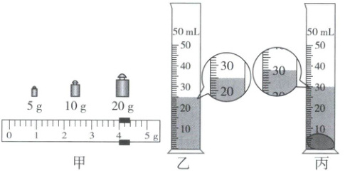 g。然后,用量筒测量金属块的体积。将水倒入量筒,液面达到的位置如图乙所示,再把金属块浸没在量筒的水中,水面升高,如图丙所示,则该金属块的体积为5