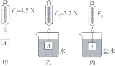 (2)计算金属块A浸没在水中所受的浮力F = G - F_示$ = F_1 - F_2 = 4.5N - 3.2N = 1.3N。$