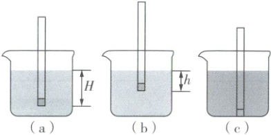 在液体中。(2) 将吸管放到水中的情景如图(a)所示,测得浸入的长度为$H$;放到另一液体中的情景如图(b)所示,测得浸入的长度为$h$。用$\rho_{液}$、$\rho_{水}$分别表示液体和水的密度,用$\rho_{水}$、$h$及$H$表达液体密度的关系式:$\rho_{液} =$