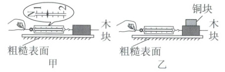 在"探究影响滑动摩擦力大小的因素"实验中,同学们根据生活经验,提出了滑动摩擦力大小可能与下列因素有关的猜想:①与接触面所受的压力有关;②与接触面的粗糙程度有关;③与接触面积的大小有关。所用的器材有:两面粗糙程度不同的木板、长方体木块、铜块和弹簧测力计等,实验装置如图甲、乙所示。