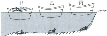 2. (2024 河南)宋朝的怀丙利用浮船打捞铁牛,展现了我国古人的智慧。如图为打捞过程示意图,先将陷在河底的铁牛和装满泥沙的船用绳索系在一起,再把船上的泥沙铲走,铁牛就被拉起,然后把船划到岸边,解开绳索卸下铁牛,就可将铁牛拖上岸。船在图中甲、乙、丙三个位置船所受浮力分别为$F_甲$、$F_乙$、$F_丙$,下列判断正确的是(