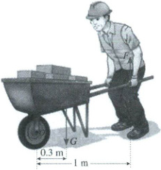 5.(人教版八下 P110 图 12.1 - 13)搬运砖头的独轮车,车子和砖头的总重力$G = 1000 N$,独轮车的有关尺寸如图所示。推车时,人手向上的力$F$至少为