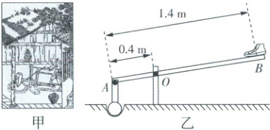 6.(北师大版八下 P109 图 9.1 - 15)如图甲所示是我国古代舂米的工具“踏碓”,图乙为踏碓结构示意图。$O$为固定转轴,$A$处连接着石球,脚踏杆的$B$处可使石球升高。起脚,石球会落下去击打稻谷,石球重$50 N$,不计摩擦和杆重。