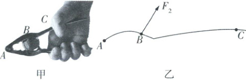 10.(人教版八下 P122 复习与提高 1 题改编)如图甲所示是一个压核桃钳子,其中$ABC$可以看作是一个杠杆,其简化示意图如图乙所示,$A$点是支点,$B$点是阻力的作用点,$C$点是动力的作用点。请在乙图中画出压核桃时,作用在$B$点的阻力$F_2$的阻力臂$l_2$,以及作用在$C$点的最小动力$F_1$和动力臂$l_1$。