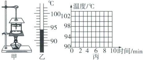 $° C$。(3) 根据表格数据在图丙中绘出水的温度随时间变化的图像,分析图像可知:水在沸腾后加热过程中,温度