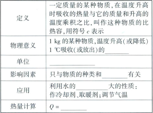 2.热量 $\mathrm{J/(kg·^{\circ}C)}$ 状态 比热容 $\mathrm{cm\Delta t}$