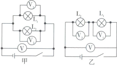 V。在图乙所示的测量电路中,闭合开关后电压表 V₁ 的示数为 2.5 V,V₂ 的示数为 3.8 V,V 的示数应为 6.3