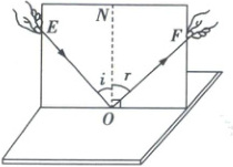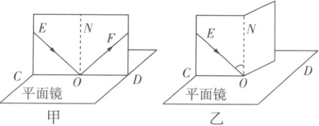 放置于平面镜上。如图甲所示,使一束光贴着纸板沿某一角度射到$O$点,经平面镜反射,沿另一个方向射出,在纸板上用笔描出入射光 EO 和反射光 OF 的径迹