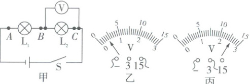 (2) 在探究串联电路的电压规律时,她用电压表测量$AB$间的电压。闭合开关后,电压表示数如图乙所示,为了使实验结果更精确,接下来应该:断开开关,