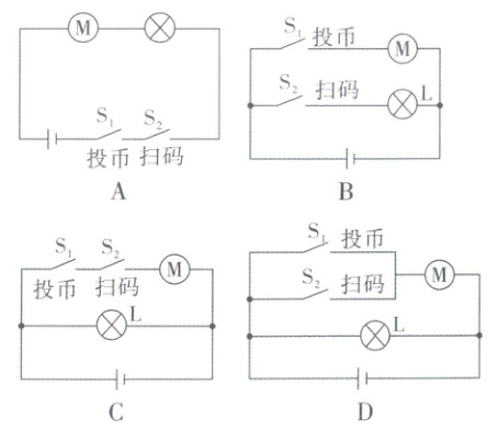 10.(2025 湖南)跨学科实践 某商场有一台棉花糖自助售货机,接通电源后,指示灯 L 一直发光,人们可通过投币或扫码的方式购买棉花糖。当投币或扫码成功时,对应开关闭合,电动机开始工作,完成棉花糖自动出售服务。下列设计的模拟电路图符合以上要求的是 (