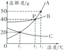 3. 将$t_1$℃时A、B、C的饱和溶液升温至$t_3$℃,溶液浓度大小: