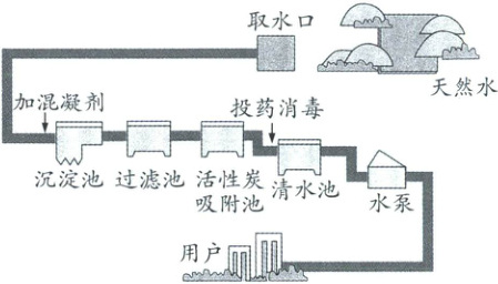 取水$\to$加混凝剂(明矾)$\to$沉淀$\to$过滤$\to$吸附$\to$投药消毒(化学变化)$\to$自来水。