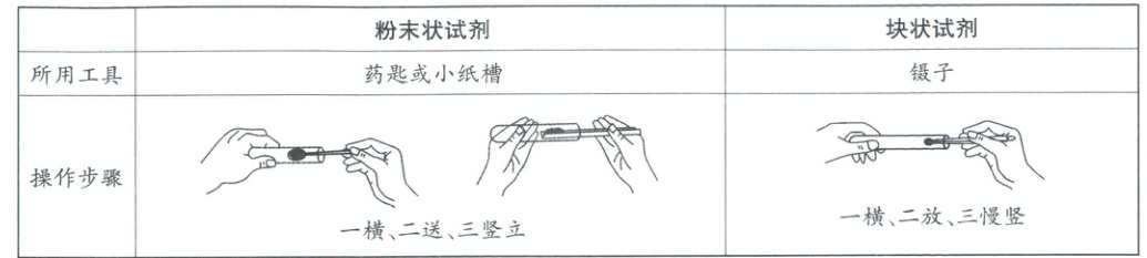 ;试管口稍稍倾斜;倾倒完毕后,瓶口在试管口靠两下(目的:防止洒落