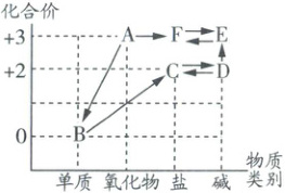 4.(2022 河南 20 题)$\mathrm{A \sim F}$是含同一种金属元素的物质,它们的转化关系如下图所示(“$\longrightarrow$”表示反应能一步实现,部分物质和反应条件已略去),图中标注了物质类别和这种金属元素的化合价。已知$\mathrm{A}$与一氧化碳反应是工业制取$\mathrm{B}$的主要原理,$\mathrm{B}$是目前世界年产量最高的金属。