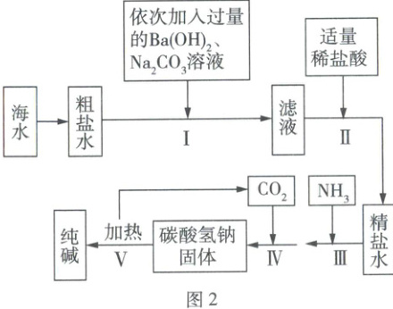 反应。(3) 我国化学家侯德榜创立了“侯氏制碱法”,利用海水为原料制取纯碱($ Na_2 CO_3$)的部分工艺流程如图 2 所示。已知粗盐水中含有氯化镁、硫酸钠、氯化钙等可溶性杂质。