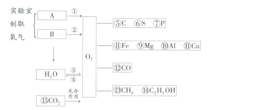 $⑤C + O₂ \xlongequal{点燃} CO₂($或$2C + O₂ \xlongequal{点燃}2CO)$