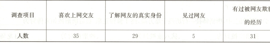 (3)【活动三】在讨论怎样交友这个环节,大家就“网上交友的利与弊”这个问题展开了热烈的讨论。有人赞成网上交友,有人反对网上交友,双方各执一词。为了更好地表达自己的观点,说服对方,请借助下面的调查表进行分析,写出你的结论。(调查总人数:50)
