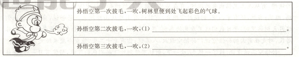 于是,孙悟空就在身上拔一根小毛,吹了一下,多么好啊。(2) 这时,小溪的上空,树林的上空,我们村里所有山冈和村屋的上空,都降下数不清的彩色的、发光的、会燃烧的花朵。也就是说,好像天空中一时降下无数闪闪发亮的火焰般的菊花、蒲公英、牡丹、杜鹃花、玫瑰、桂花和金银花、百合花——到处飞舞。