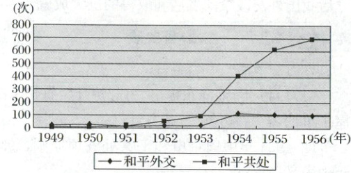2.B 解析:根据材料图片信息可知,从1953年到1956年“和平外交”使用频率骤然增加,“和平共处”则每年以成倍增长的速度被《人民日报》使用,这显然与和平共处五项原则的提出有着直接的关系,标志着新中国外交政策逐步走向成熟,故选B项;1949年中华人民共和国成立伊始提出独立自主的和平外交政策,独立自主是指国家的主权是独立的,不允许任何外来的干涉与侵犯,每个国家都有权根据自己的实际情况独立地、自主地处理本国对内对外的一切事物,与材料主旨不符,排除A项;中美关系正常化是在20世纪70年代,排除C项;新中国冲破美国外交孤立政策的标志是同苏联等17个国家建立外交关系,排除D项。