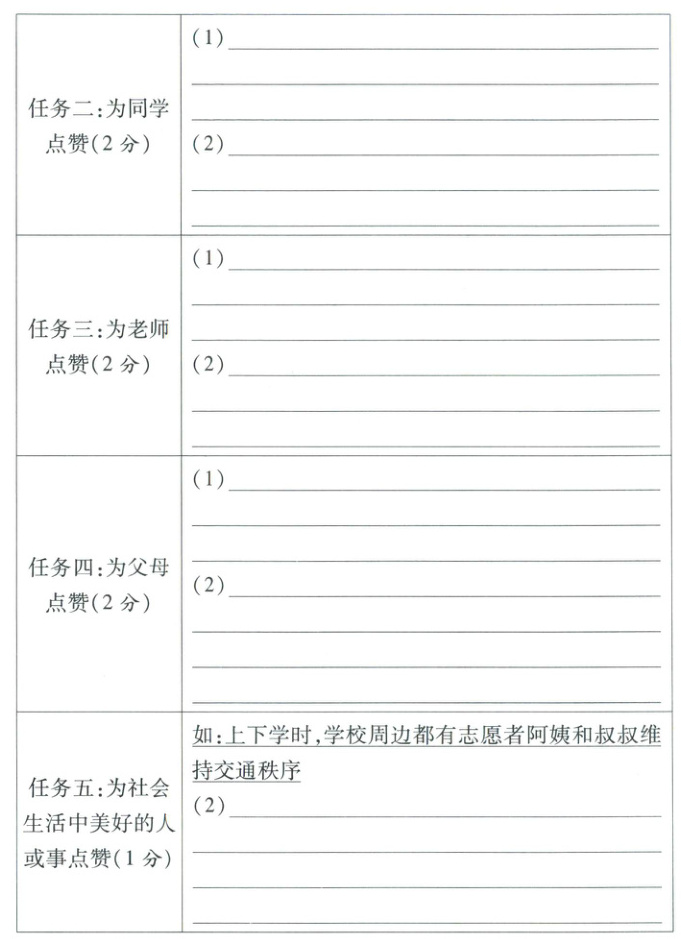 (1)任务一:我在老师的帮助下,养成了听课做笔记的习惯;我能够正确对待同学和朋友给我指出的缺点和不足等。任务二:我的同桌最爱帮助同学;我们班的同学承诺一定诚信考试等。任务三:我的数学老师耐心细致;班主任王老师平时像妈妈一样关心着我们等。任务四:妈妈每天早上都会为我准备好热腾腾的早餐;在我生病时,爸爸妈妈无微不至地照顾我等。任务五:冬天到了,我们社区的叔叔阿姨买了新棉衣为困难地区的孩子送温暖;法院的叔叔阿姨到我校义务进行普法教育等。