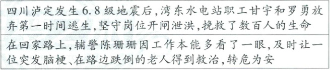 16.C 【解析】甘宇和罗勇坚守岗位泄洪挽救生命,辅警陈珊珊及时让老人得到救治,都体现了他们敬畏生命,关爱他人。故选C。