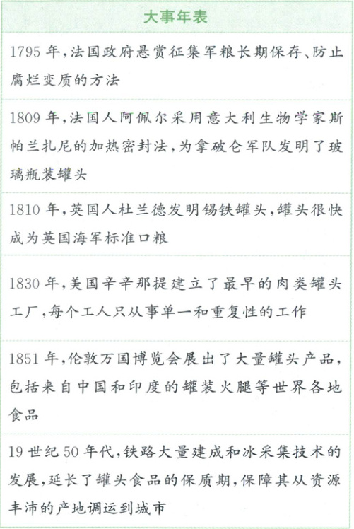 19世纪初,在殖民扩张和战争中,法国人为满足军队需要,借助生物技术,发明了罐头食品。此后,制作罐头的工艺不断更新。