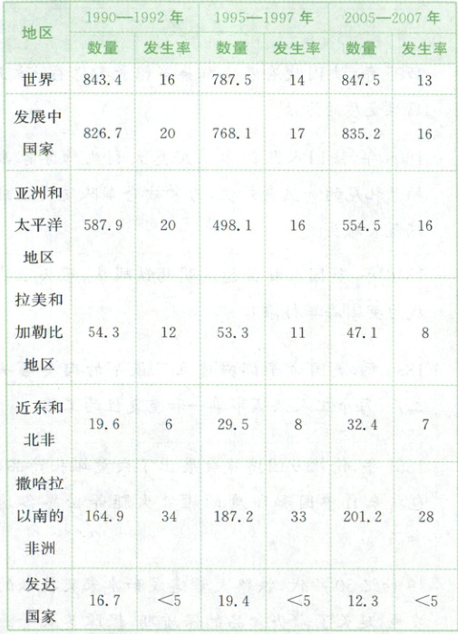 (高考经典题)阅读世界各地区饥饿人口数量及饥饿发生率变化情况表(单位:百万、%)。据此可知 (