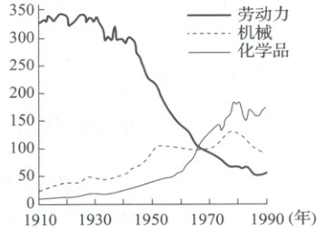 [针对训练2] 下图为美国农业的投入使用量(以1967年指数为100)。对该图的合理解释是 (