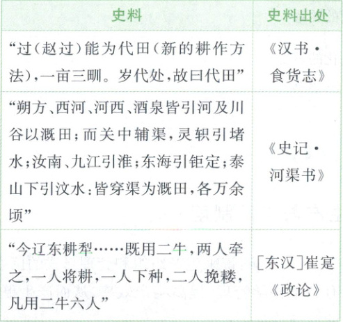 1.B 解析:根据材料可知,史料中描述了代田法的应用、灌溉工程的建设以及多人合作的农耕方式,这些都体现了农业生产中的精细化操作和耕作方式的改进,故选B项;铁犁牛耕技术成熟的标志是唐代曲辕犁的发明,排除A项;汉代农业经济模式仍是自然经济,并未取得突破,排除C项;三部汉代书籍仅是各自摘取涉及农业发展的一项,难以看出作者的重农思想,排除D项。