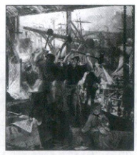 2. 右图是1860年英国艺术家威廉·斯格特创作的油画《铁与煤》,正中间是四个挥舞着铁锤正在锻造着机械零件的工人,他们孔武有力却面无表情,右侧背对着他们的工头手里拿着皮鞭,唯一正脸对外的是一个面露天真微笑的小女孩,整个工作环境油腻脏乱。这反映出当时 (