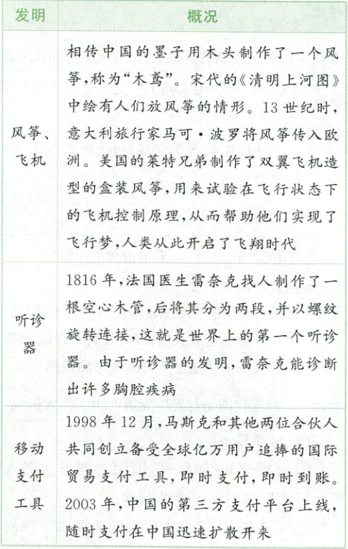 阐述:春秋时期的墨子通过对生活的观察,发明了木鸢,放风筝因此成为古代人们喜爱的户外活动。第二次工业革命期间,莱特兄弟利用风筝原理做出了飞机模型,造出了人类历史上第一架飞机,为后来航天事业的发展作出了卓越贡献。19世纪初,法国医生雷奈克发明的听诊器,增强了胸腔疾病诊断的准确性。随着信息技术的发展,国际贸易支付工具应运而生,推动了国际贸易的发展。中国第三方支付平台的出现,改变了人们的消费习惯,给人们的生活带来巨大便利。