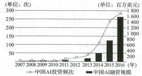 1. 下图为 2007—2016 年中国人工智能(AI)投资频次与融资规模的发展趋势。据下图可推知(