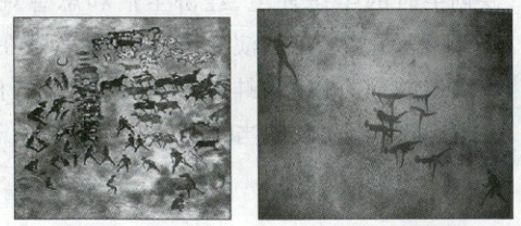 4. 下图为阿尔及利亚塔西利-恩-阿耶洞穴壁画,绘制于5000—6000年前,第一幅显示人们正在放牧,第二幅显示人们正在收割。根据壁画信息能得出的结论是 (