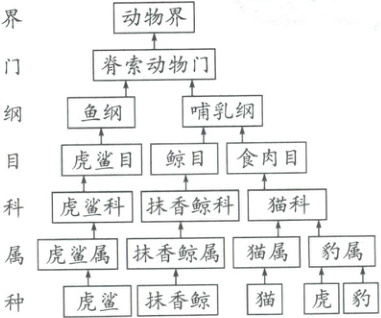 (5)虎鲨和抹香鲸都生活在海洋中,且外部形态也很相似,但在分类上却相差较远,因为动物分类除了比较外部形态结构,还要比较动物的