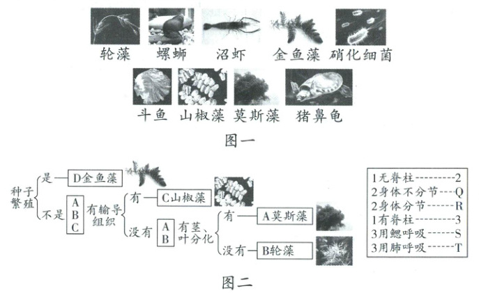 5.(8 分)鱼缸造景是热带鱼饲养与种植水草的基础上新兴起来的 一项艺术。图一是在鱼缸造景中常使用的一些生物,某校生物 学兴趣小组的同学在学习完《尝试对生物进行分类》后,对其中的植物进行了分类如图二,并对其中的四种动物制作了分类检 索表,如下表。请据图回答问题。