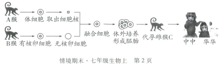 11. 科学家们提取了雌性胎儿 A 猴的体细胞,将其细胞核注射到取自 B 猴的去核卵细胞中,最终生下了两只健康的猴子(如图)。这意味着中国科学家成功突破了现有技术无法克隆灵长类动物的世界难题。如图为“中中”和“华华”产生的过程示意图。请据图回答问题: