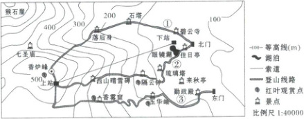 8. 在秋高气爽的时节,小明和同学们准备前往北京香山游玩。请你利用带等高线的香山景点分布图帮助小明制定游玩计划。