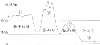 读“四种陆地地形类型的剖面示意图”(如图),结合所学知识,完成5-7小题。