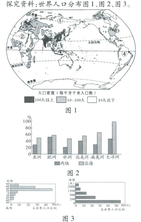 (2) 结合图1、图2、图3归纳世界人口稠密地区的共同分布特点。(2分)
