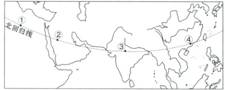 小明利用暑假期间,沿北回归线依次游览了四个地区。如图为世界局部地区图。据此完成4-5小题。