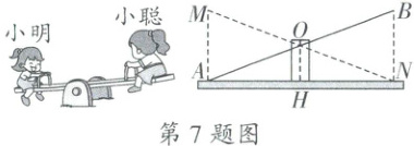 7.如图,小聪和小明玩跷跷板游戏,支点 O 是跷跷板的中点(即 OA=OB),支柱 OH 垂直于地面,两人分别坐在跷跷板 A,B 两端,当 A 端落地时,$∠AOH=70°$,则 AB 上下可转动的最大角度$∠AOM=$