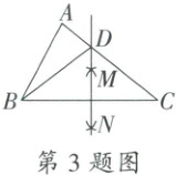 3. 如图,在$\triangle ABC$中,$\angle C = 40°$,分别以点$B$和点$C$为圆心,大于$\frac{1}{2}BC$的长为半径画弧,两弧相交于$M,N$两点,作直线$MN$,交边$AC$于点$D$,连接$BD$,则$\angle ADB$的度数为(